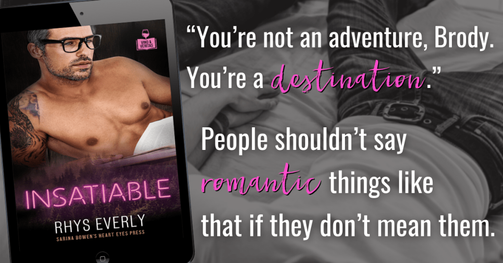 Insatiable is a standalone book in the Vino & Veritas series by Heart Eyes Press and contains a big/small, grumpy/sunshine pairing, a bed-hopping author, a jilted sugarmaker and a reluctant fake relationship.